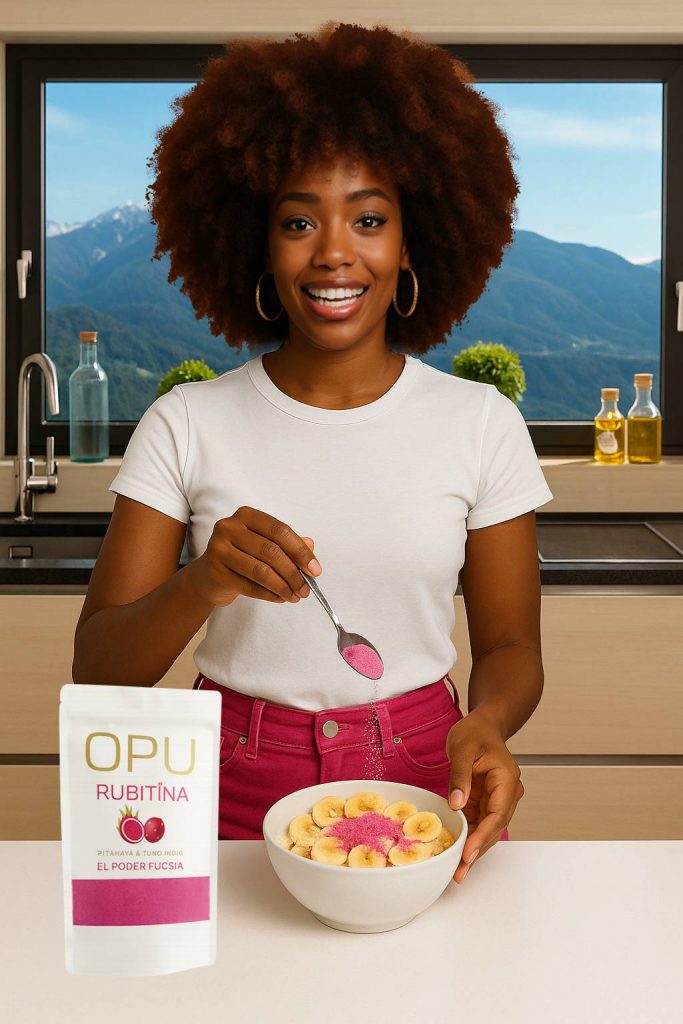 Imagina tu bol de cereales, yogur o fruta… y ahora, añade Rubitina: una mezcla única de Pitahaya roja y Tuno Indio que concentra un potente cóctel de antioxidantes, vitaminas y minerales.